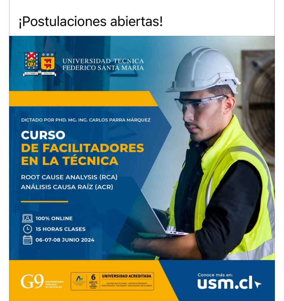 Con la finalidad de impulsar el conocimiento y la innovación en el campo de la ingeniería en mantenimiento, el Departamento de Mecánica de la Universidad Técnica Federico Santa María, ha logrado un alcance exitoso con los cursos de capacitación, «Facilitadores de Análisis de Causa Raíz» y «Mantenimiento Centrado en Confiabilidad».